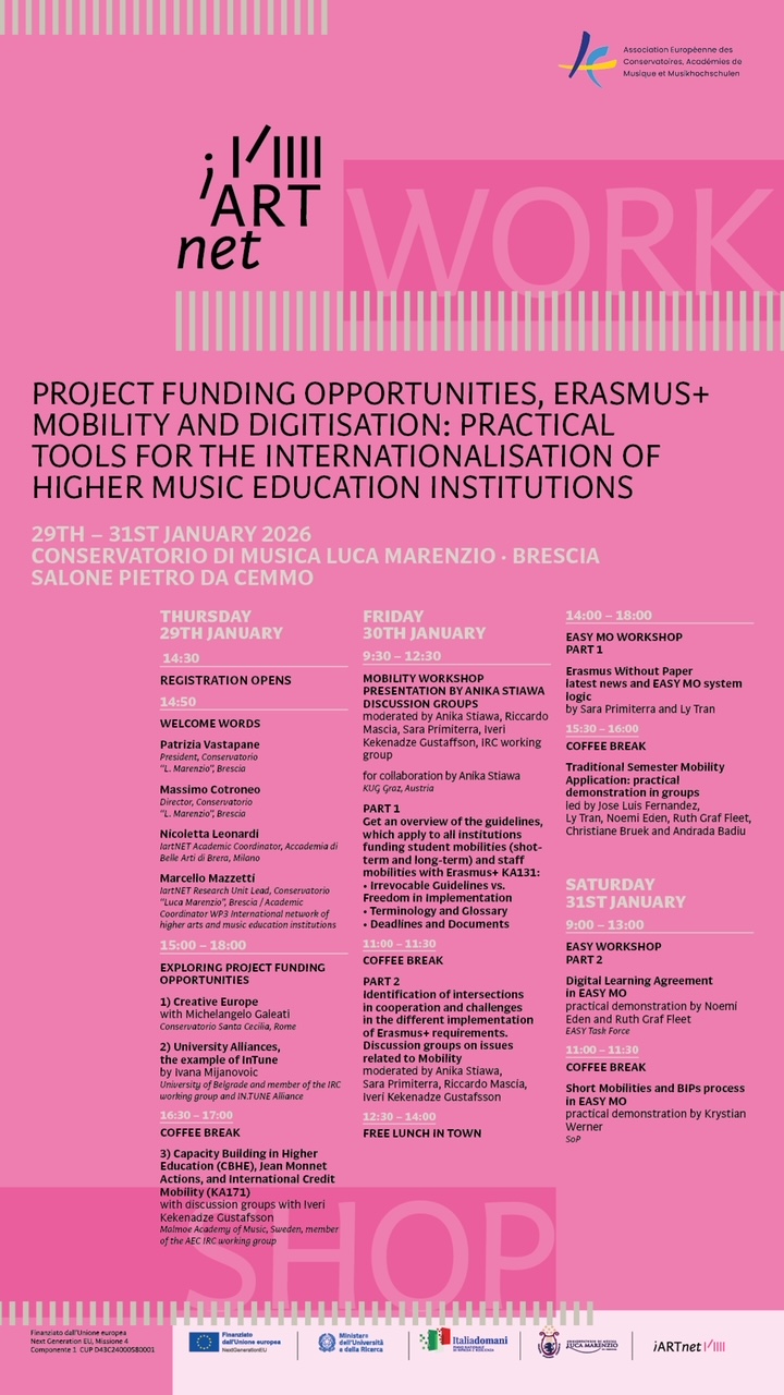 This three-day international workshop, organised by the AEC – European Association of Conservatoires within the framework of the PNRR project IartNet and hosted by the Conservatorio Luca Marenzio in Brescia, offers a comprehensive and practice-oriented exploration of European funding opportunities and Erasmus+ mobility processes relevant to higher music education institutions.