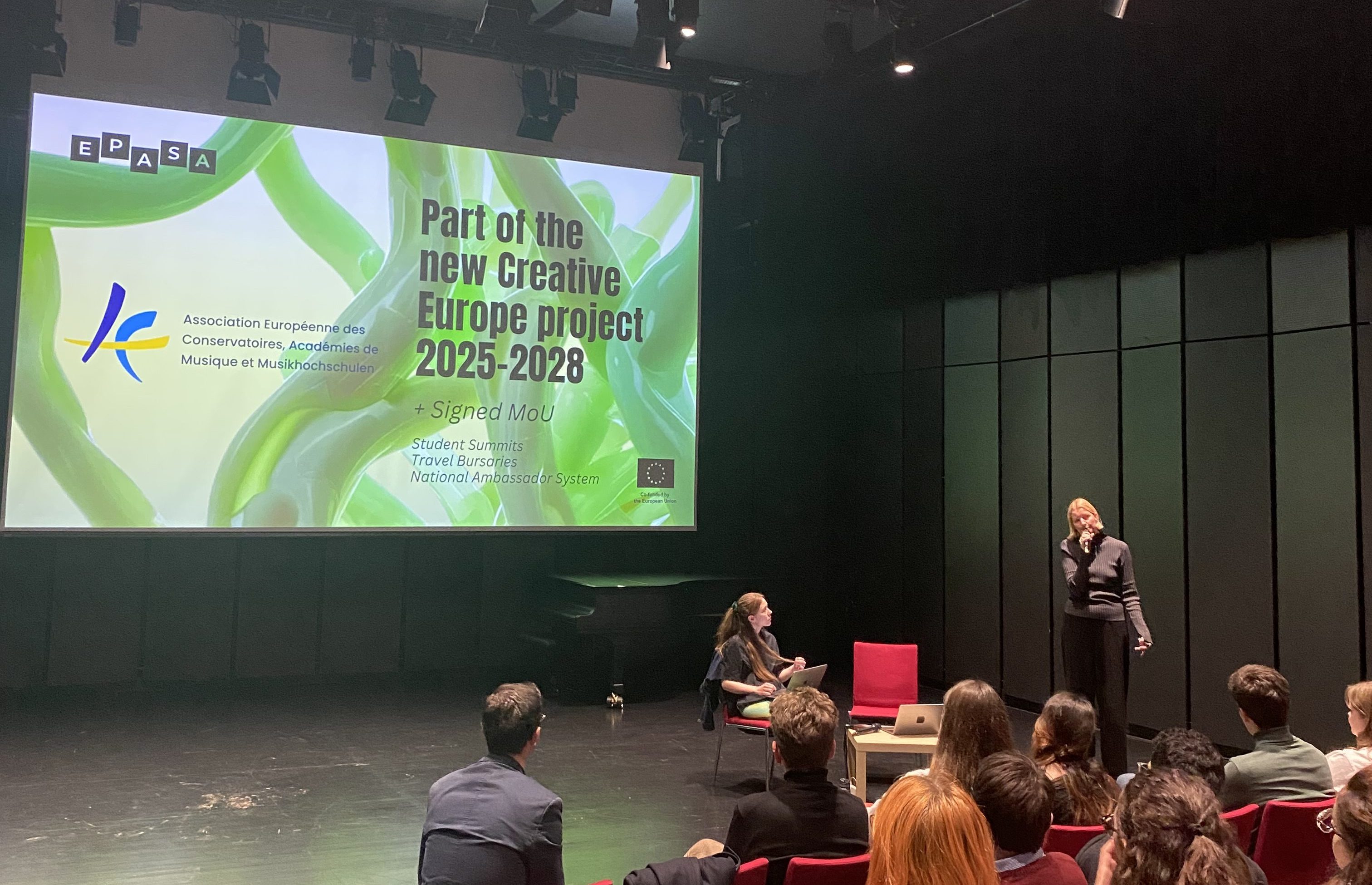 Natalie Roe (Royal Welsh College, Wales) as President, Marloes De Nul (Conservatorium Maastricht, Netherlands) as Vice-President, Jack Mahony (MTU Cork School of Music) as Secretary General, and Louise Schrøder (The Royal Academy of Music Aarhus, Denmark), Berta Homs (ESMUC, Spain), and Carlo Mazzini (Conservatorio Giuseppe Verdi di Milano, Italy) as Board Members.
