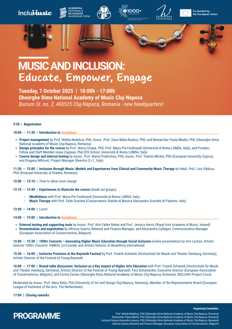 On Tuesday, 7 October 2025, the Gheorghe Dima National Academy of Music (ANMGD) in Cluj-Napoca, Romania, will host Music and Inclusion: Educate, Empower, Engage, the concluding dissemination event of the IncluMusic project (Increasing skills for building more inclusive conservatoires), co-funded by the European Union. This scientific gathering will bring together project partners and international experts to present the outcomes of IncluMusic and reflect on its contribution to advancing inclusion in Higher Music Education (HME).