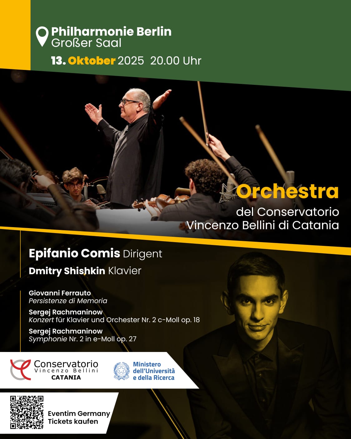 The Symphony Orchestra of the Conservatorio Bellini of Catania will give a concert at the Berlin Philharmonie, presenting a program centered on major works by Sergei Rachmaninov and Giovanni Ferrauto.
