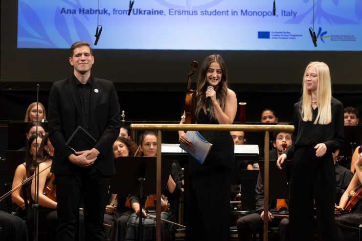 The performance was conducted by Maestro Elio Orciuolo, from the Conservatoire of Monopoli “Nino Rota”, who led the musicians through a rich and inspiring programme showcasing both the dynamism of the young performers and the diversity of European musical traditions. Prior to the concert, students Ana Habruk (Ukraine), Mateusz Woch (Poland) and Sara Harutyunyan (Armenia) took the floor to tell the audience how the Erasmus programme had changed their lives.